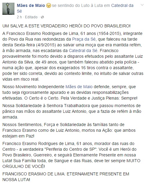 Em imagens exclusivas o Datena abre o mar vermelho: um lado clamando inferno a Luis, outro clamando louvor a PM. E você, Francisco, no meio disso tudo. Desse vermelho que te escorre o peito, Sé abaixo – olha lá ele, morto.