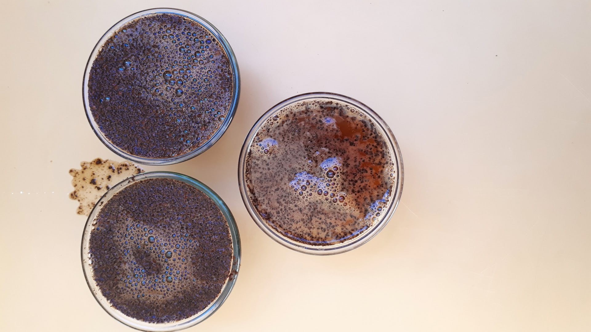 Agora, hora de pegar o pote que sua mãe usa para servir pudim, OPA quer dizer, sua xícara de prova. Você coloca cada café em um deles. Formando aquele triângulo. Por que? A ideia é ir fazendo um zigue zague. Analisa o primeiro café, que está na base, depois o que está no ‘topo’ do triângulo, e acaba no 3, que também está na base.
