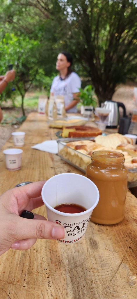 achou que estava faltando alguma coisa nesse passeio? Uma degustação, por exemplo! pois é óbvio que não vai faltar. Em uma clareira charmosa, a família montou uma mesa cheia de delícias e, claro, café coado na hora.