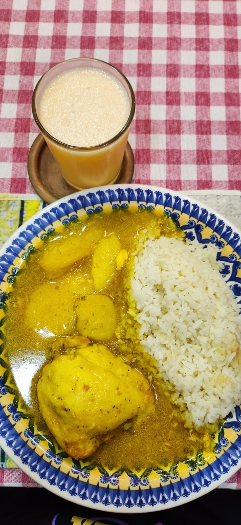 - almoço campesino, com arroz, frango e várias delícias 🥘. mais suco!